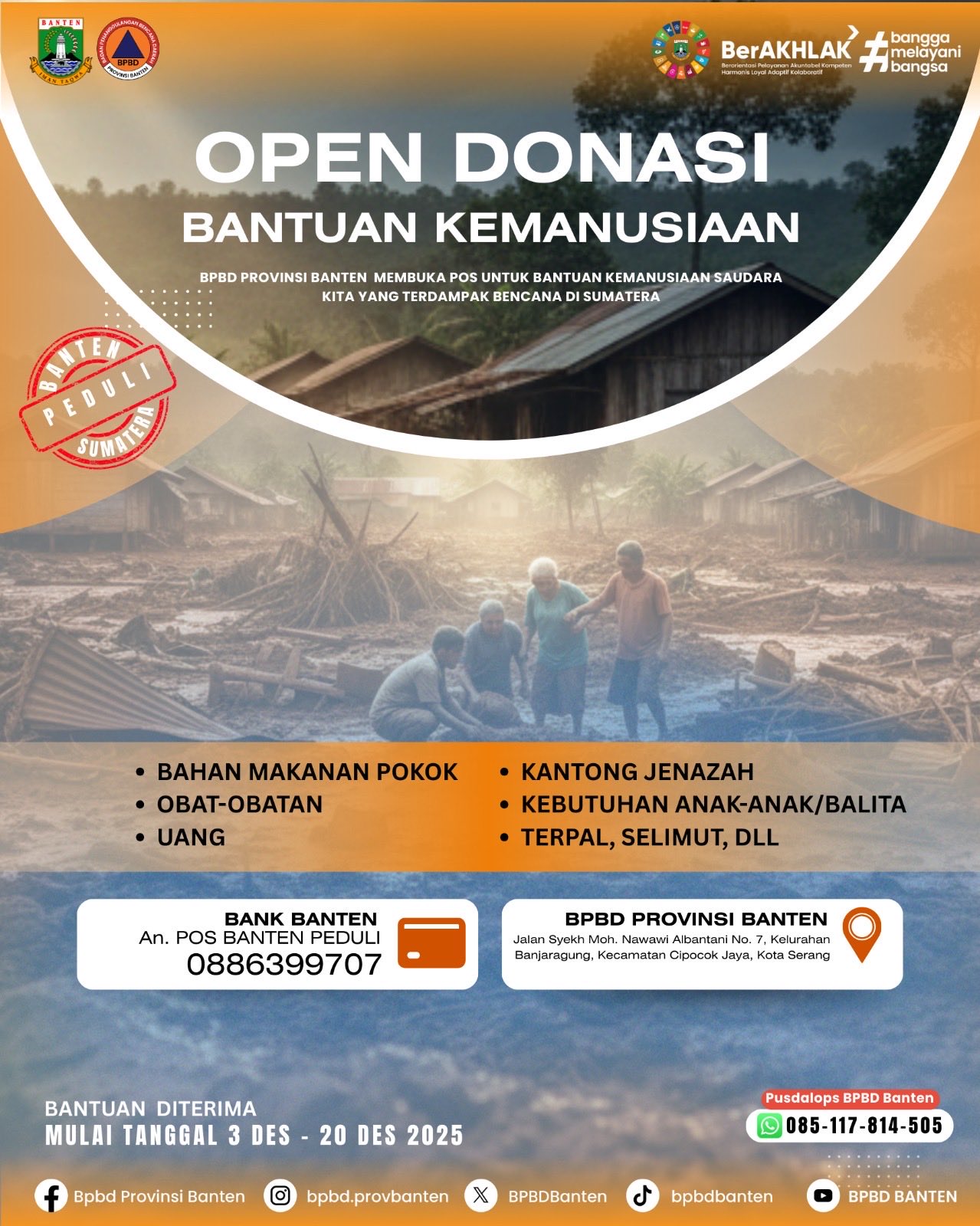 RMBANTEN.COM - Serang, Donasi Bencana Alam – Badan Penanggulangan Bencana Daerah (BPBD) Provinsi Banten resmi membuka open donasi bantuan kemanusiaan bagi warga terdampak bencana di wilayah Sumatera.
